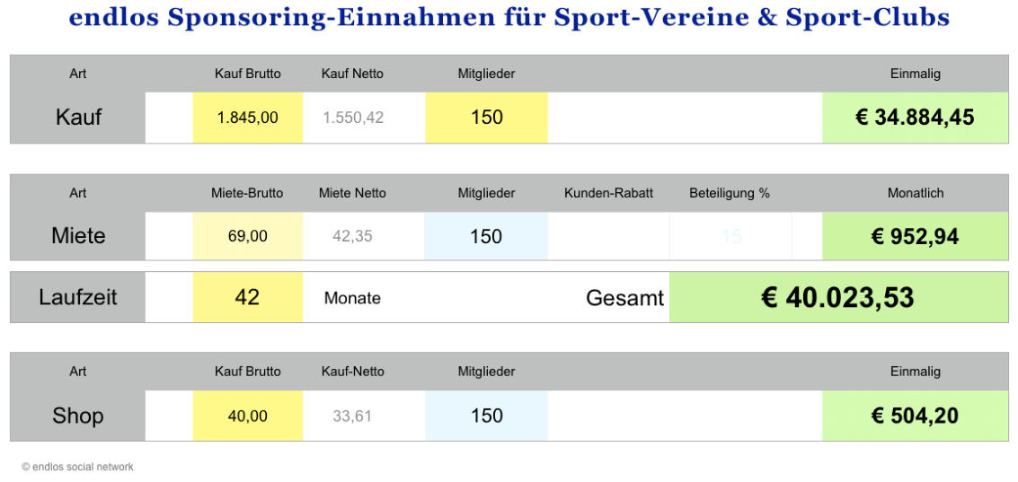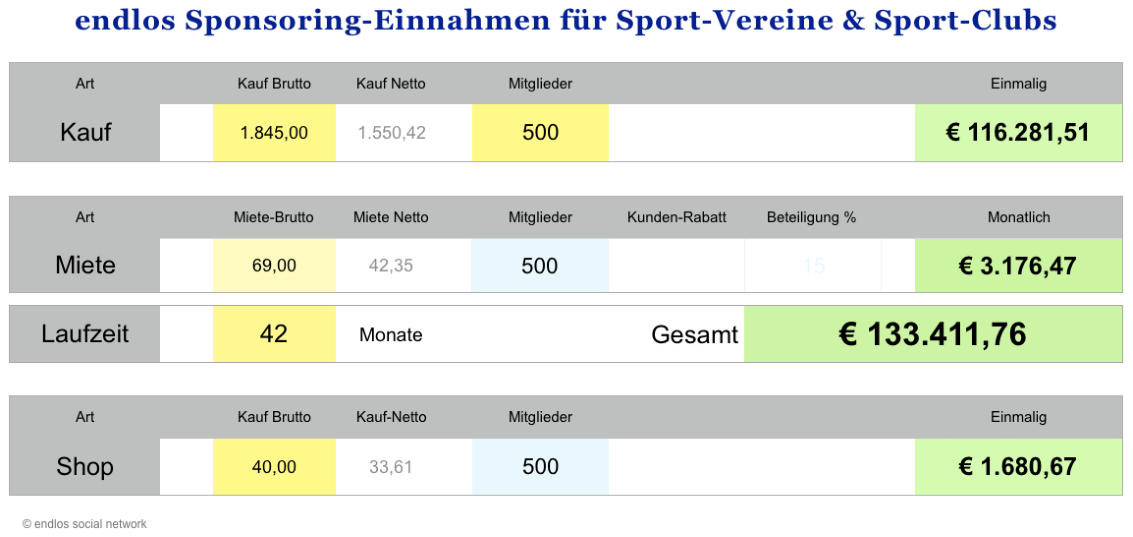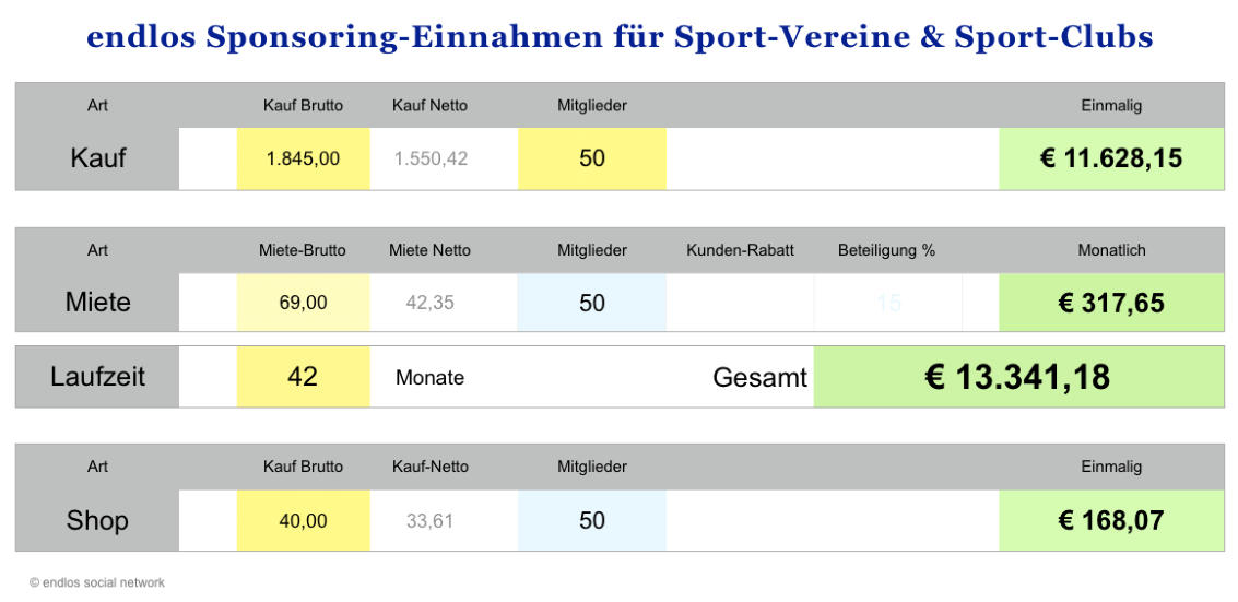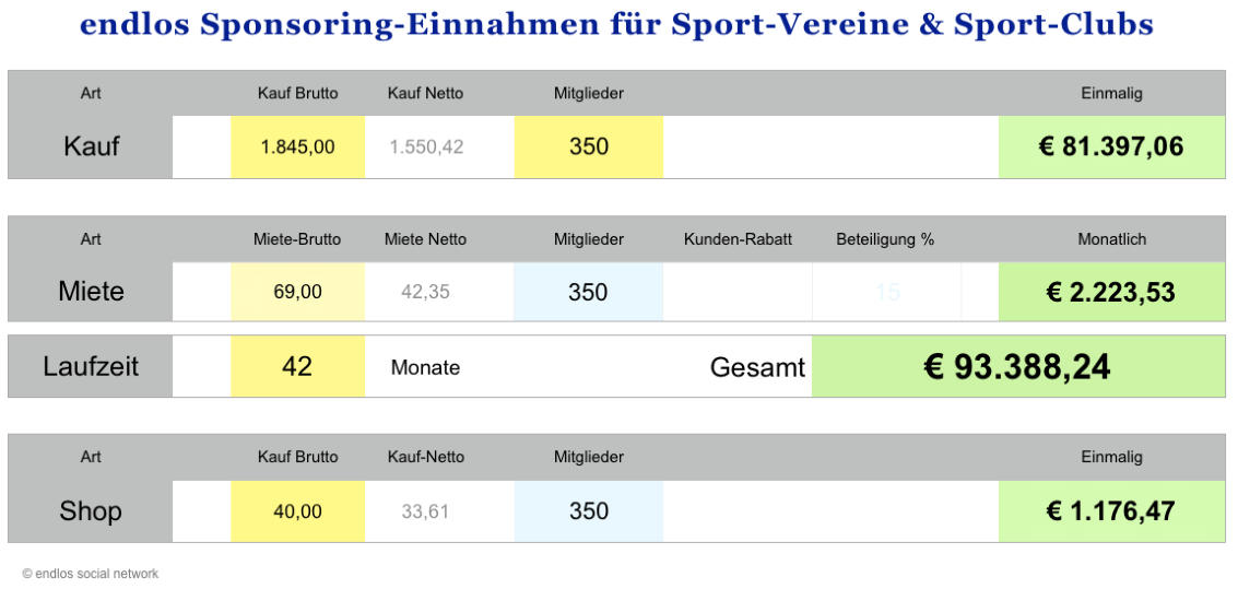 In unseren Beispielen gehen wir davon aus, dass die Vereins- / Club- Mitglieder und / oder dessen Umfeld (Familie, Freunde, Bekannte) entweder eine Trinkwasser Aufbereitungs- Anlage kaufen oder für 42 Monate mieten! Durchschnittlicher Kaufpreis je nach Modell = 1.845,- € inkl. MwSt. Durchschnittlicher Mietpreis je nach Modell = 69,- € inkl. MwSt. Bei den Miet-Varianten sind die Kosten für die jährlichen Filterwechsel inklusive der Montagekosten mit im Mietpreis enthalten, somit entstehen dem Vereins- / Club- Mitglied keinerlei zusätzliche Kosten! Falls die Vereins- / Club- Mitglieder oder dessen Umfeld (Familie, Freunde, Bekannte) zusätzlich im endlos Shopping-Center einkaufen, so erhält der Verein / Club auch davon Sponsoring Einnahmen! Durchschnittlicher Einkauf je nach Produkt / Dienstleistung = 40,- € inkl. MwSt.